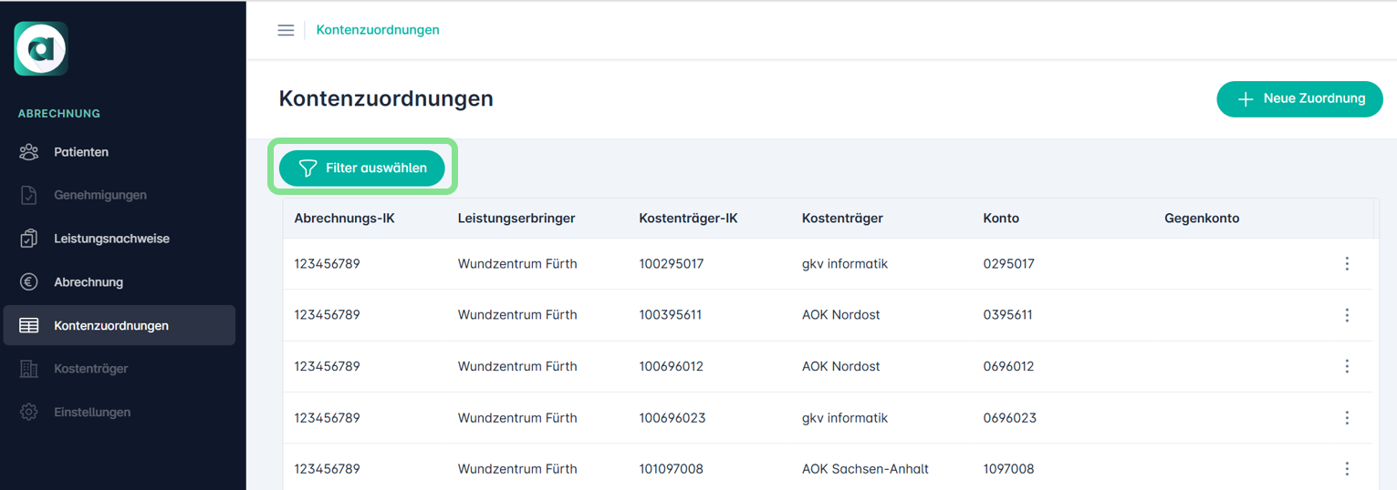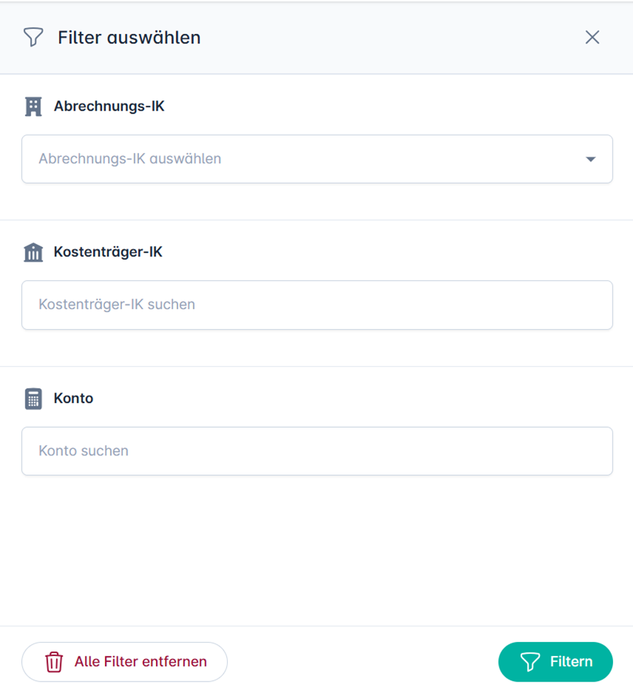 Bei einer großen Anzahl an Kostenträger-IK hilft die Filterfunktion, den Überblick zu behalten. Nutzen Sie den Button „Filter auswählen“, um die Liste effizient zu durchsuchen.