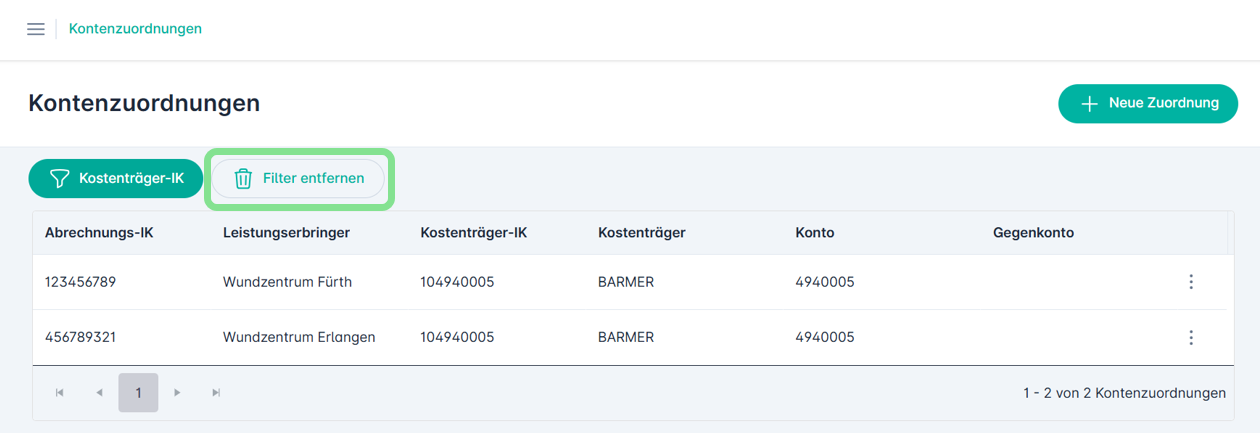 Aktive Filter können einzeln oder über den Button „Alle Filter entfernen“ gelöscht werden.