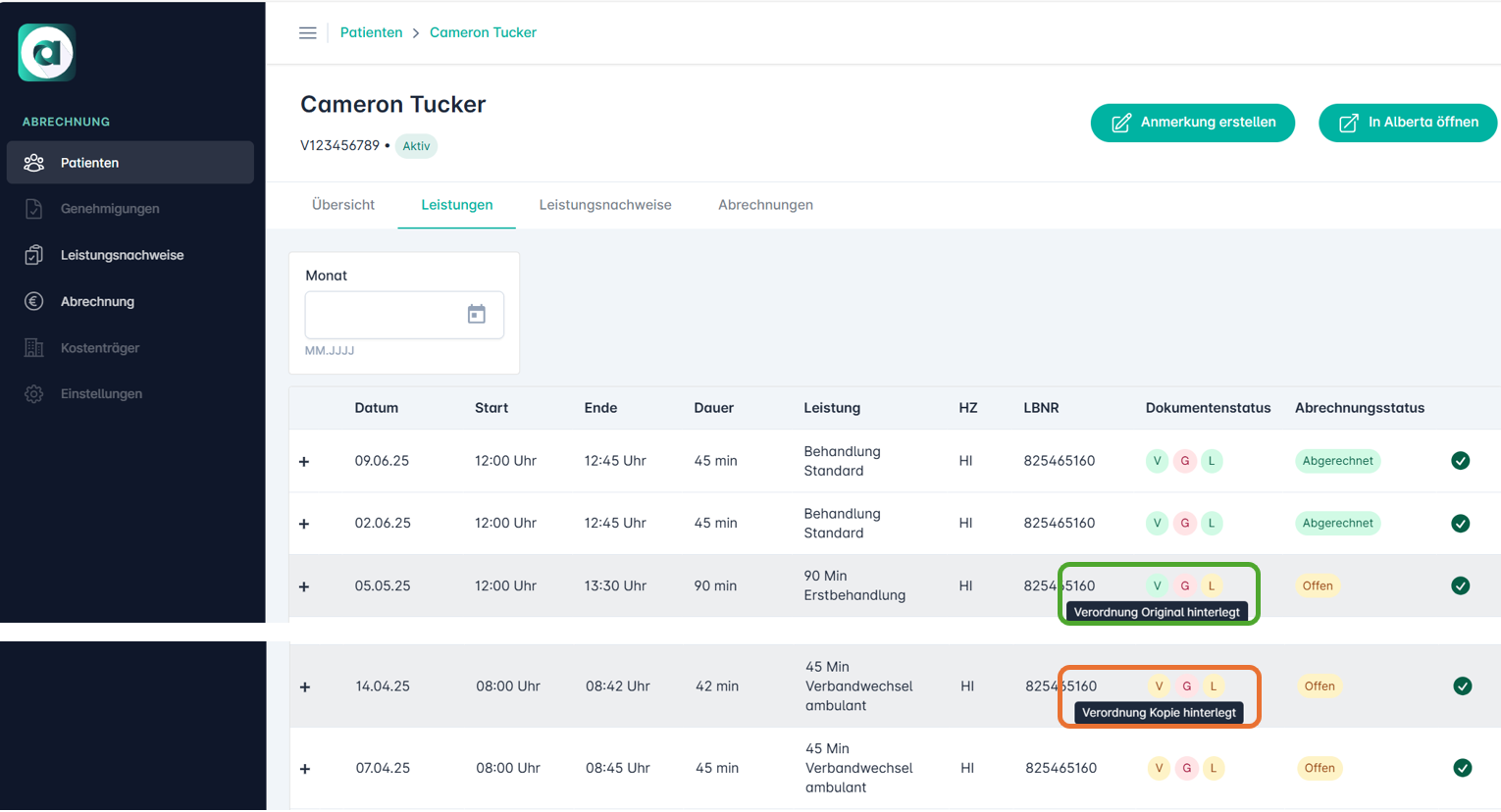 - Status "Gelb": Wird in Alberta eine "Verordnung Kopie" hochgeladen, wechselt der Statusindikator ("V") in der Leistungsliste ab sofort auf Gelb (statt bisher Grün).
