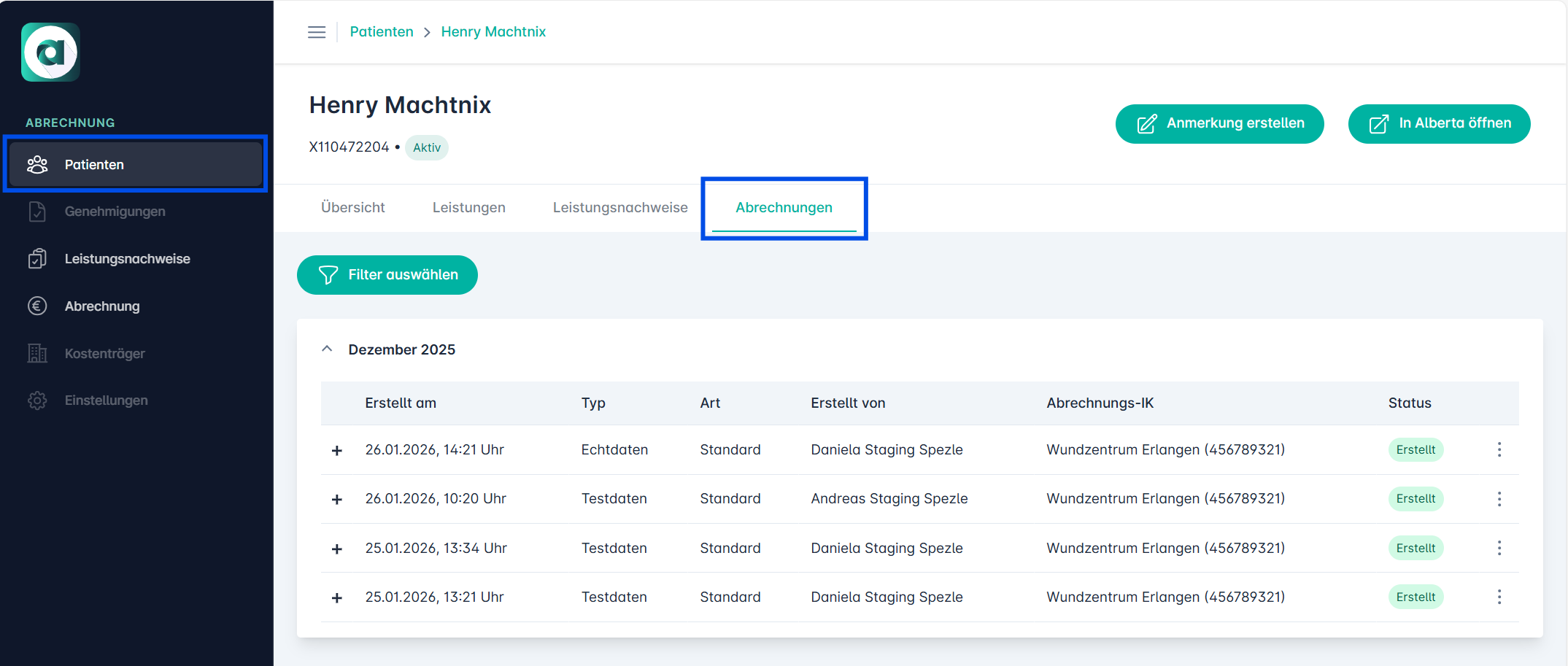 Wichtiger Hinweis: Bitte beachtet, dass in der patientenbezogenen Abrechnungsübersicht aus technischen Gründen nur Abrechnungen angezeigt werden, die ab dem 10.12.2025 erstellt wurden. Ältere Rechnungen sind weiterhin über die globale Abrechnungsübersicht einsehbar.