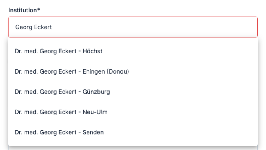 🏥 Eindeutige Auswahl von Institutionen: Beim Hinzufügen von Benutzern wird neben dem Namen jetzt auch der Standort angezeigt – hilfreich zur Unterscheidung von Ärzten mit demselben Namen.