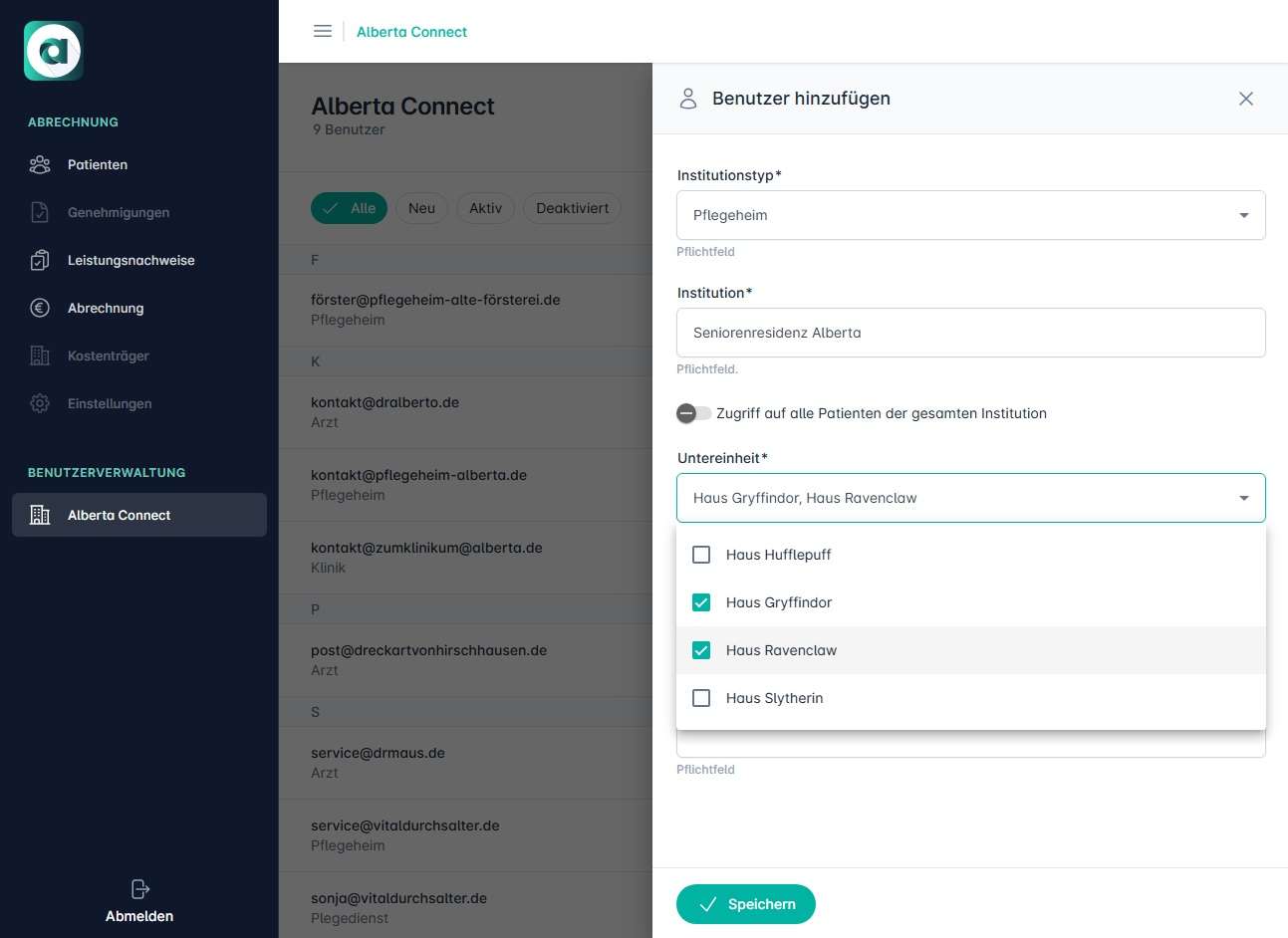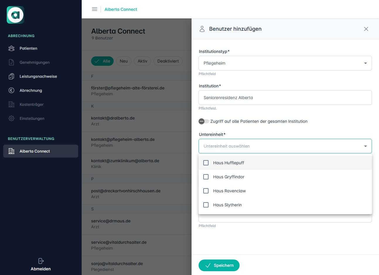 Beim Erstellen eines Benutzerzugangs kann auch aus bestehenden Untereinheiten (insofern diese in Alberta gepflegt sind) ausgewählt werden, sollte der Benutzer z.B. nur Zugang auf Patienten eines bestimmten Wohnbereiches haben und nicht auf alle Patienten der gesamten Einrichtung, kann dies hier auch eingestellt werden.