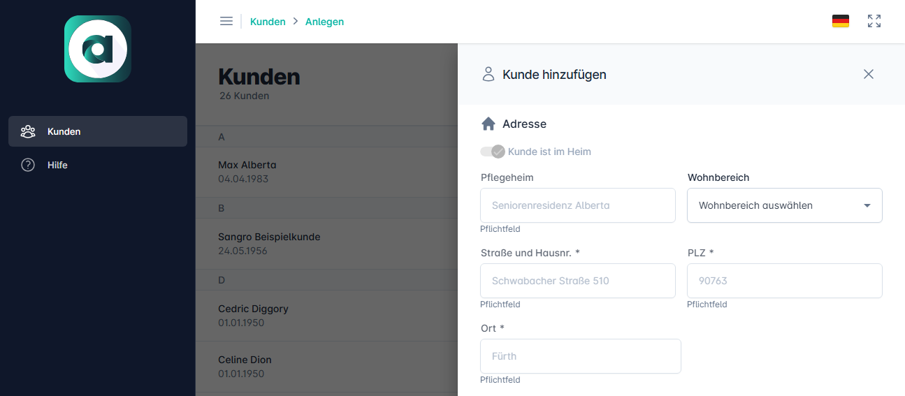 - Nach der Auswahl werden die Adressdaten automatisch übernommen, der Wohnbereich kann noch ergänzt werden.