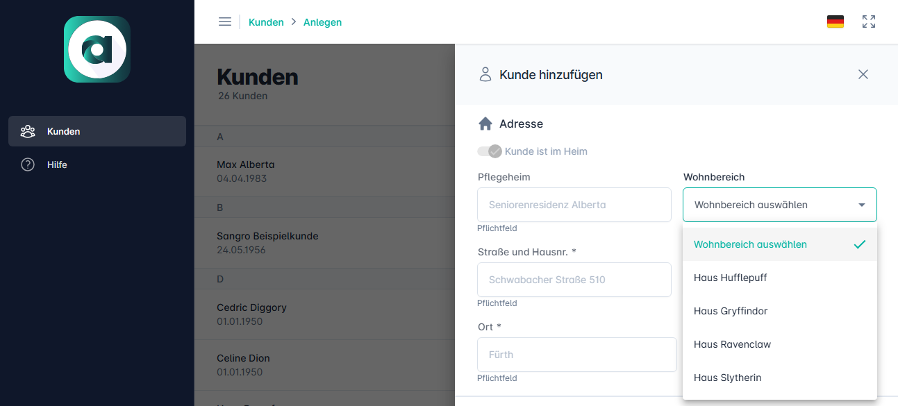 - Wohnbereich: in diesem Fall ist lediglich der Wohnbereich aus wählbar, insofern diese in Alberta durch das Homecare Unternehmen hinterlegt wurden.