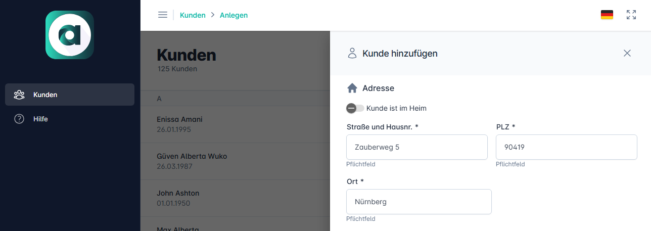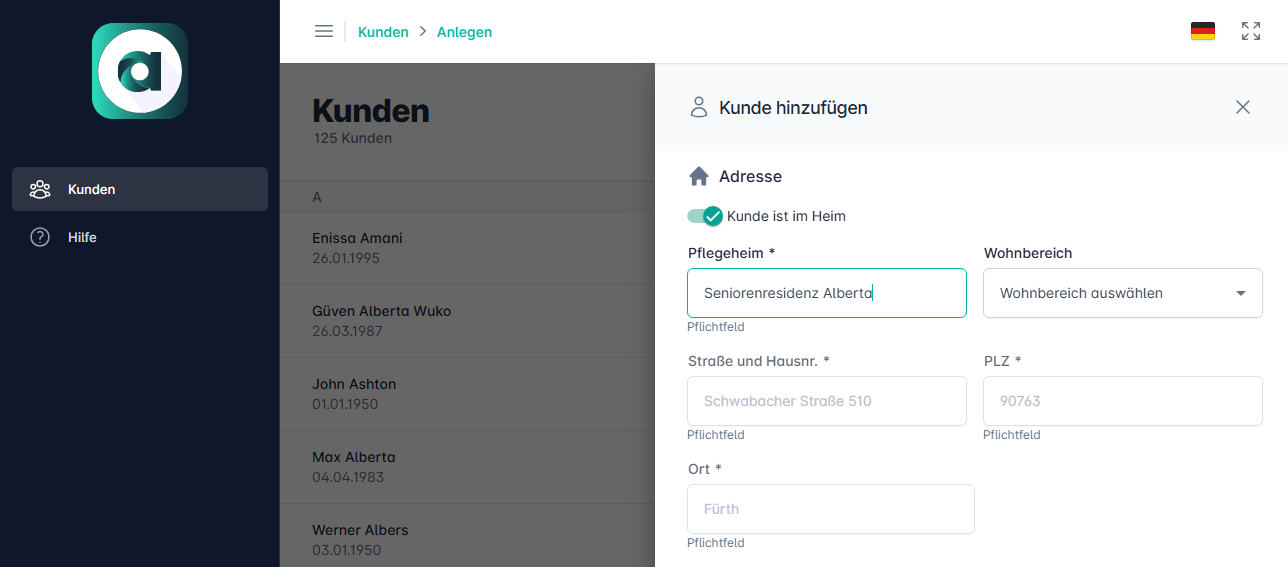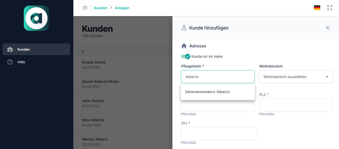 - Dafür einfach "Kunde ist im Heim" anwählen und im Feld "Pflegeheim" nach der Einrichtung suchen.