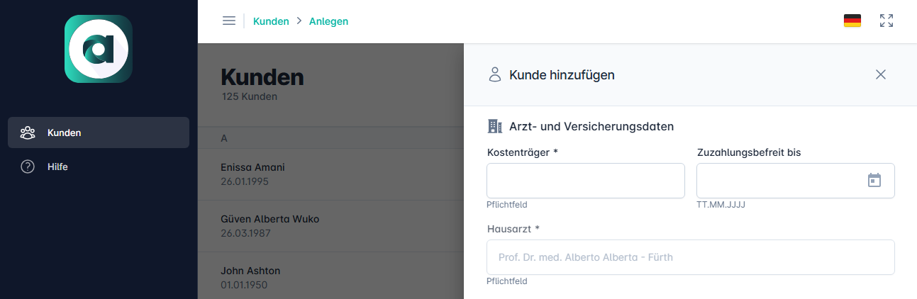 - Kostenträger: In diesem Feld einfach die entsprechende Krankenkasse auswählen. Sollte diese nicht bekannt sein, kann auch die Auswahl "Unbekannt / nicht mitgeteilt" getroffen werden.
