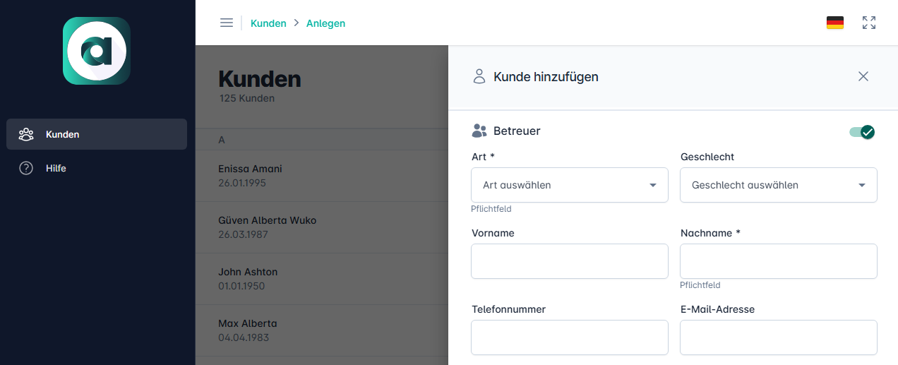 - Art: Pflichtangabe, hier kann die Art des Betreuers ausgewählt werden, z.B. "Ehefrau" oder "Tochter"