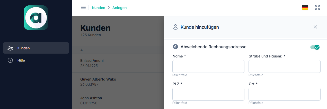- Name, Straße und Hausnr., PLZ und Ort sind dabei Pflichtangaben und können als Freitext eingegeben werden.