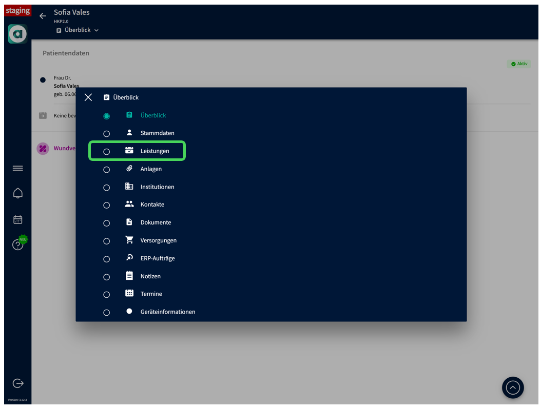 Alle leistungsbezogenen Tätigkeiten starten in der Patientenakte des jeweiligen Patienten. Öffnen Sie die Akte und navigieren Sie zum Reiter 'Leistungen'.