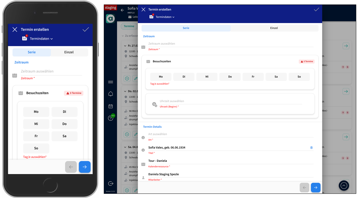 - Serientermin: wiederkehrender Besuch (Zeitraum + Wochentage + Uhrzeit)