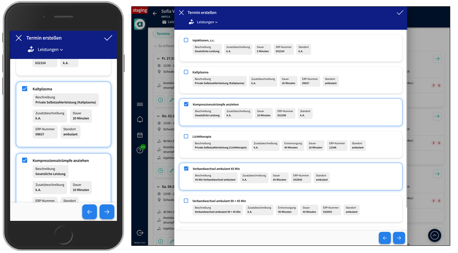 - Wenn Sie einen Behandlungsort angegeben haben (Ambulant / Wundzentrum), werden nur passende Leistungen angezeigt.