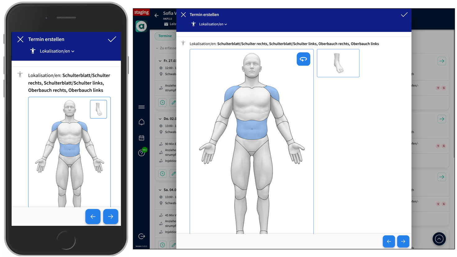 - Wählen Sie die betroffene Körperstelle über die Wundpuppe aus. Eine Mehrfachauswahl ist möglich.